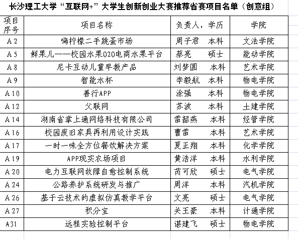 云顶国际vip8866于9月2日晚组织了“互联网+”大学生创新创业大赛校级比赛,经专家评委、助理评委共同评分,经研究决定推荐以上15个创意类项目,6个实践类项目参加省项,具体名单如下,请各学院及项目负责人按照《关于“乐易考杯”湖南省“互联网+”大学生创新创业大赛全省复赛有关事项的通知》的要求做好相应赛事准备工作,争取优秀成绩!