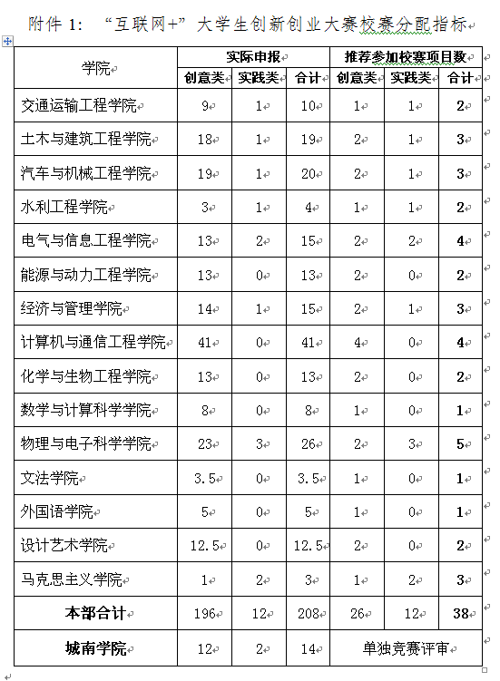 2、为了保证校级竞赛的水平,应本着宁缺毋滥的原则进行推荐,各学院推选的各组别参赛项目可低于附表1的参赛项目配额要求。