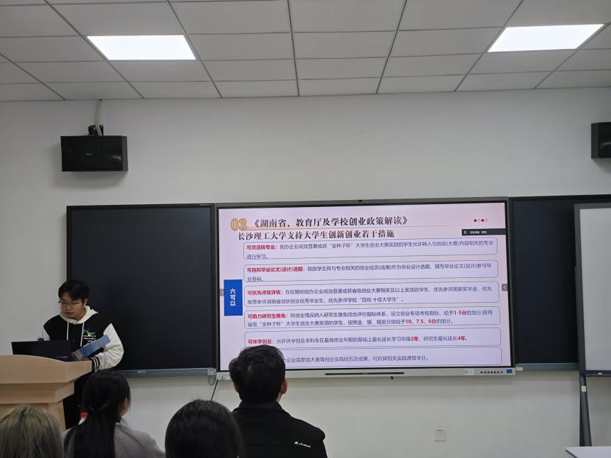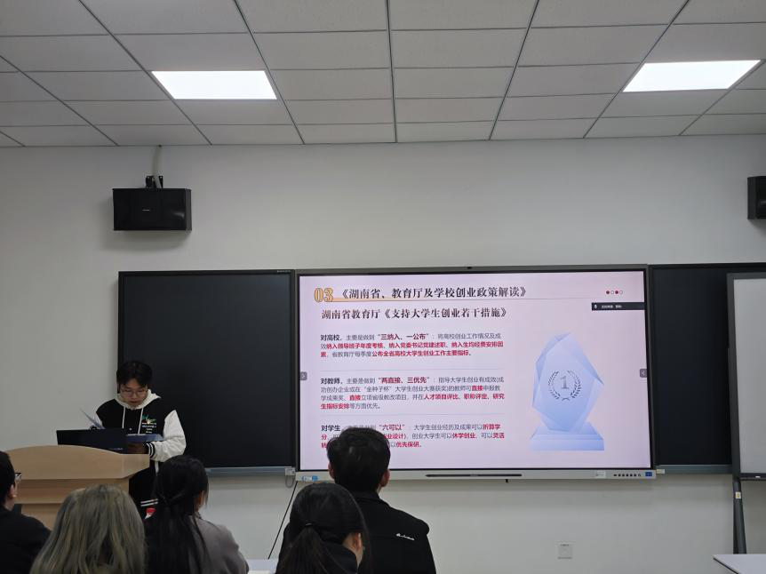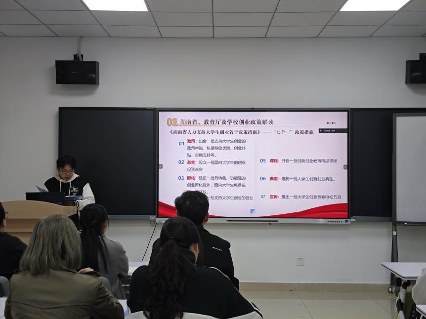 活动中,黄金同志详细解读了《湖南省大力支持大学生创业若干政策措施》的核心内容,重点介绍了“七个一”举措,并结合《支持大学生创业若干措施》《云顶国际vip8866支持大学生创新创业若干措施》等文件,系统阐释了“两直接”“三优先”“两配套”及“六可以”等具体政策。针对学生群体,我们详细介绍了政策中的“六可以”,包括:创业经历及成果可折算学分、可替代毕业论文(设计)、创业学生可休学创业、可灵活转专业、可参评评优评先、可推荐免试保研。此外,黄金同志还介绍了本校大学生创新创业园的相关扶持政策,以及第二届“金种子杯”大学生创业大赛的实施方案,鼓励同学们,特别是作为高年级党员,积极把握政策机遇,带动广大学弟学妹锤炼创新本领,勇于投身创业实践。