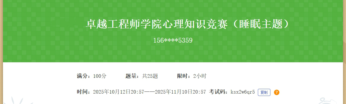 为积极响应学院第九届世界精神卫生周“卓越心晴,共愈成长”的号召,并延续世界精神卫生日关于睡眠健康的主题宣传,卓工学院心理部于10月12日至11月10日,精心策划并成功举办了为期近一个半月的“睡眠与心理健康”网络知识竞赛。本次活动依托线上“赛事星”平台,旨在以新颖便捷的形式,帮助同学们进一步夯实心理健康知识,尤其深化对科学睡眠重要性的理解,在全院范围内营造了“以赛促学、以学促行”的积极氛围。