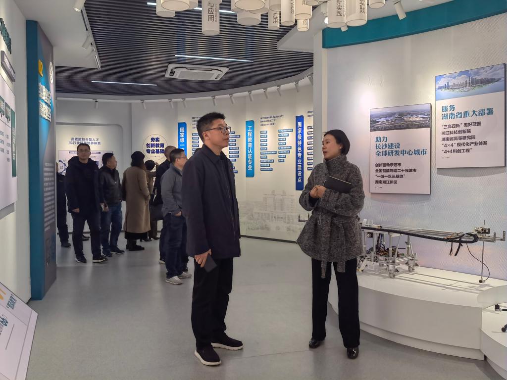 与会人员围绕湘江卓越工程师学院建设与实践经验等方面进行了深入交流。会后,周智华一行实地参观了学校大学生创新创业展厅、项目制教学场地。