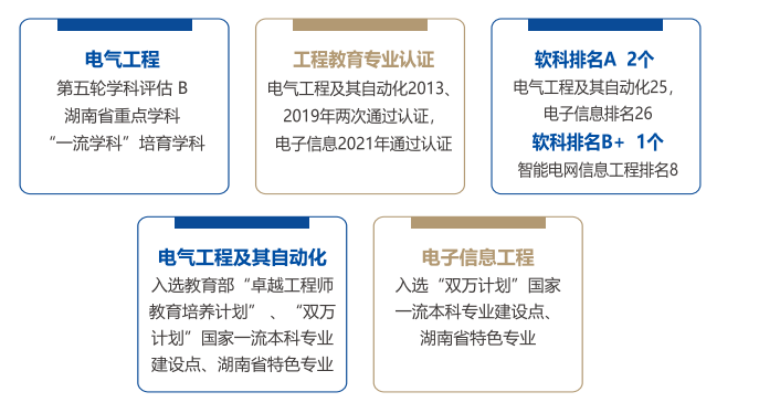 电气与信息工程学院(/dq/index.htm)是学校的主干学院和国家电力行业人才培养的传统基地之一,始建于1956年长沙水力发电学校的发配电专业,行业特色鲜明,70年来累计为电力系统输送专门人才3万余人。现有电气工程博士后科研流动站,电气工程一级学科博士学位授权点、能源动力专业博士学位授权点;有电气工程、电路与系统、新一代电子信息技术(含量子技术等)、工程管理硕士专业学位授权点。开设电气工程及其自动化、智能电网信息工程、电子信息工程3个本科专业,拟新增电气工程与智能控制本科专业。