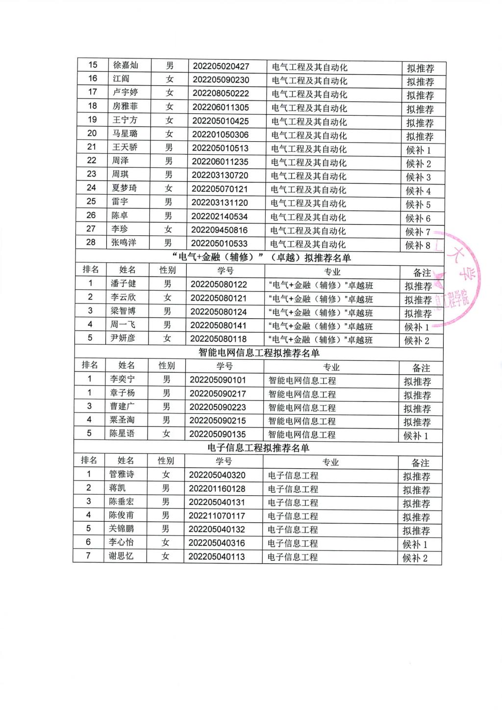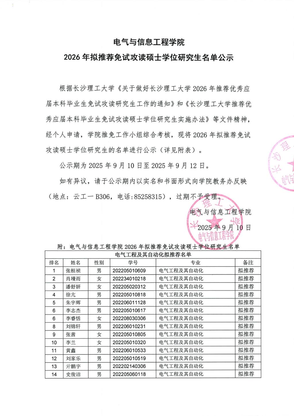 电气与信息工程学院 2026年拟推荐免试攻读硕士学位研究生名单公示