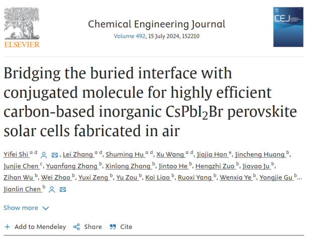 本研究成果以Bridging the buried interface with conjugated molecule for highly efficient carbon-based inorganic CsPbI2Br perovskite solar cells fabricated in air”为题撰写的论文,已国际顶级期刊《Chemical Engineering Journal》(影响因子IF=15.1,中科院一区TOP期刊)发表。电气学院教师时一斐为第一作者,硕士研究生张雷为学生第一作者电网防灾减灾全国重点实验室(云顶国际vip8866)为第一完成单位。这项工作推动了空气中制备全无机钙钛矿电池的研究,拓展了共轭材料的应用,深入探究了界面工程中共轭材料的影响效果和作用机理,为其他类型钙钛矿太阳能电池以及发光二极管、光电探测器、场效应晶体管等器件的研发提供了新思路。