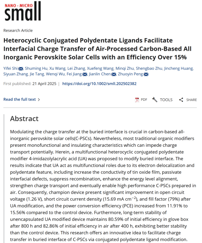 本研究成果以“Heterocyclic conjugated polydentate ligands facilitate interfacial charge transfer of air-processed carbon-based all inorganic perovskite solar cells with an efficiency over 15%”为题撰写的论文,已在国际顶级期刊《Small》(Q1区,影响因子IF=13.0,TOP期刊)发表。学院教师时一斐为第一作者及通讯作者,硕士研究生胡书铭为学生第一作者。此外,姜飞教授、彭卓寅教授和陈建林教授为共同通讯作者,电网防灾减灾全国重点实验室(云顶国际vip8866)为第一完成单位。这项工作推动了空气中制备全无机钙钛矿电池的研究,探索了共轭多齿配体材料的新应用,深入探究了埋底界面中共轭多齿材料的影响效果和作用机理,为其他类型钙钛矿太阳能电池以及发光二极管、光电探测器、场效应晶体管等器件的研发提供了新思路。