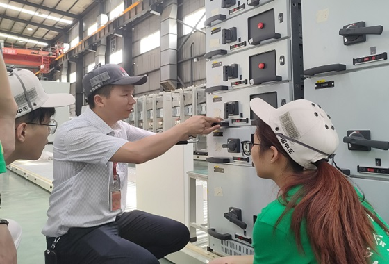 进入车间前,杨经理着重强调了“电气五防”等安全规范,随后讲解了高压配电柜的相关知识。大到机身梁柱的结构,小到螺栓的颜色、质地和强度,都有做详细介绍。当讲到配电柜的材料时,经理说到:“实用性专利不胜枚举。因此,要善于发现工业生产中问题。一个微不足道的创新都有可能带来质的改变。”随后,为培养实践队员操作能力,杨经理让各位队员亲自操作了旋进式开关柜,“转两圈,进入试验状态;转四圈,柜体才会完全打开”,杨经理用简单易懂语言向实践队员介绍抽屉柜的检验方式。