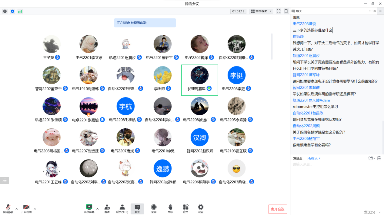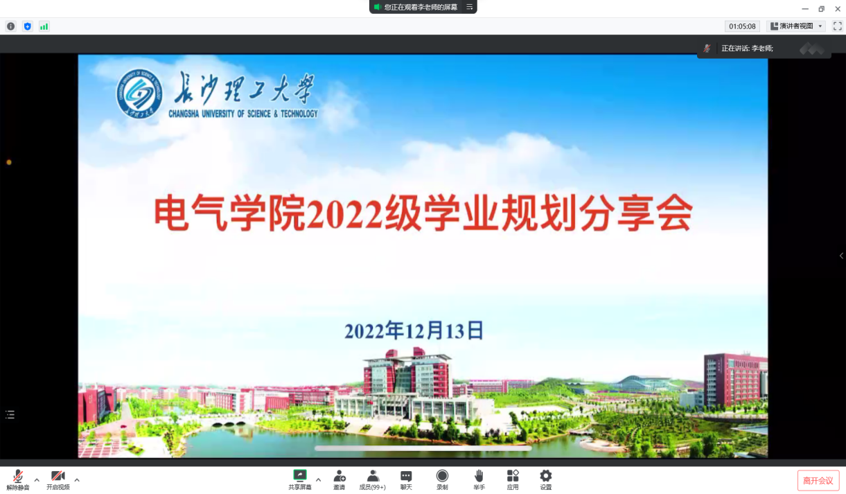 为帮助新生深入了解学业规划思路与方法,引导学生结合自身实际系统科学地规划学业,12月13日晚7点,电气学院通过线上会议举行了大学学业规划分享会。19级保研学生代表罗宇航、刘潇韩、周嘉里做分享,22级全体学生线上参加。