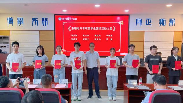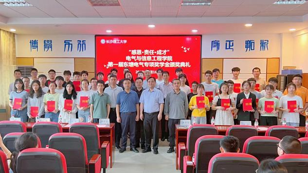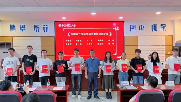 据悉,“东塘电气专项奖学金”由郴州市东塘电气设备有限公司出资设立,用于奖励我院家庭经济困难、自强不息、品学兼优的大学生和学生干部。颁奖典礼上,伍接朝代表学院对郴州市东塘电气设备有限公司的慷慨捐赠表示衷心感谢,对获奖的同学们表示热烈的祝贺。他回顾了过去一年学院在学术科研、人才培养、学科建设等方面取得的成就,希望与企业进一步推动产教融合,通过校企合作为祖国的电力事业培养更多人才,同时勉励同学们牢记总书记嘱托,胸怀天下立大志,培根铸魂明大德,锐意进取成大才,实干笃行担大任,在真刀真枪的奋斗中成就一番事业,为祖国的建设与发展贡献长理电气智慧与力量。