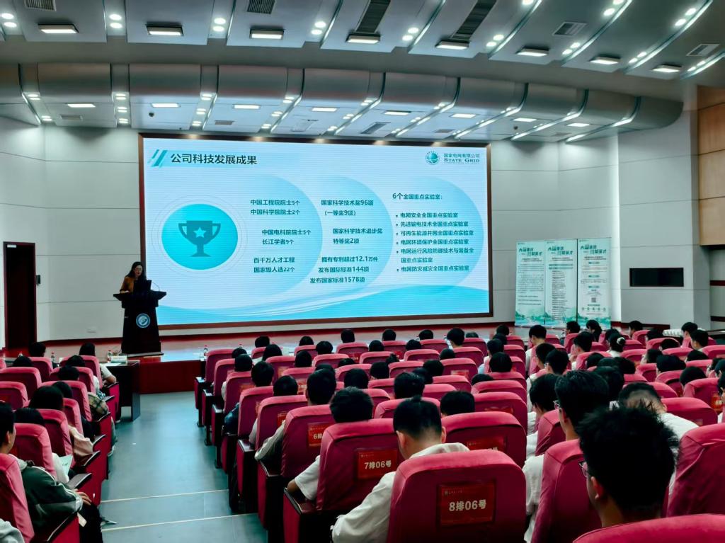 参加招聘宣讲会的同学们首先观看了国家电网校园招聘宣传片。宣传片全面、立体、直观介绍展示了国家电网有限公司企业概括、人才战略和企业文化。随后国家电网有限公司宣讲员王小帅进行了校园招聘宣讲,介绍了各直属单位的人才招聘相关情况。
