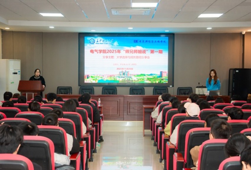 11月26日晚,云顶国际vip8866电气与信息工程学院在云塘校区工科一号楼B503举办《从迷茫到清晰:我的大学选择与成长路径》主题分享会。2025级辅导员田孟萍、朱杰,以及190名学生共同参加。本次分享会特邀华北电力大学研究生、电气学院智能电网信息工程专业2021级本科生乔梦雪主讲。