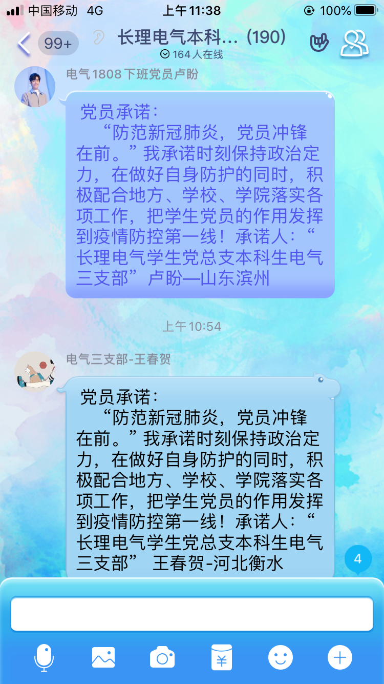 “防范新冠肺炎,党员冲锋在前。我承诺时刻保持政治定力,在做好自身防护的同时,积极配合地方、学校、学院落实各项工作,把学生党员的作用发挥到疫情防控第一线!让党旗在疫情防控斗争第一线高高飘扬!”2月5日晚,湖北籍学生的QQ群里响起了学生党员整齐划一的承诺声。