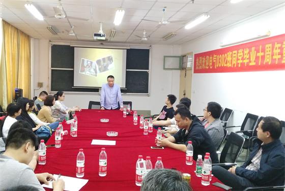 校友们在电苑楼A407欢聚一堂,在班长的主持下,召开了毕业10年后的第一次班会,原学生工作办公室辅导员吴文斌和刘卓明两位老师应邀出席。大家首先观看了同学精心制作的校园生活老照片PPT,然后一一汇报了自己10年的心路历程,回味了大学4年最难忘的一件事。刘卓明老师也分享自己当年担任辅导员的各种感慨,吴文斌老师向校友们介绍了学院近十年的发展概况。校友们为学院的快速发展感到无比骄傲,表示一定会在工作岗位上为母校争光添彩。