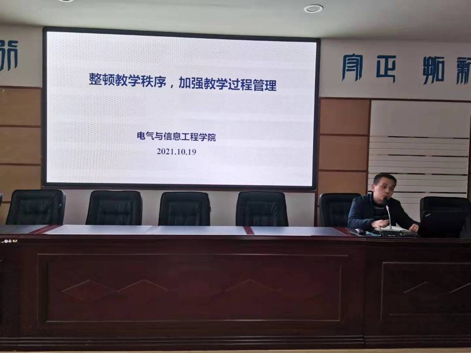 10月19日下午,电气学院在工科一号楼B503室召开了专门教学工作会议,会议由书记符慧林主持,副院长唐欣做了“整顿教学次序,加强教学过程管理”专题报告,学院全体教职工参加。