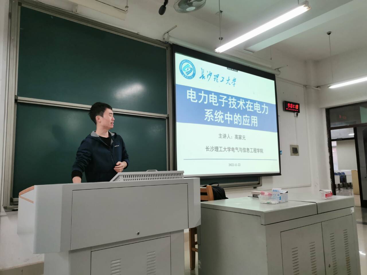 11月22日上午,电气学院在工科一号楼B218教室,举办了通识教育学术讲座,我院高家元博士作了“电力电子技术在电力系统中的应用”的主题讲座,教务办主任黄建华和76名相关学生聆听了讲座。
