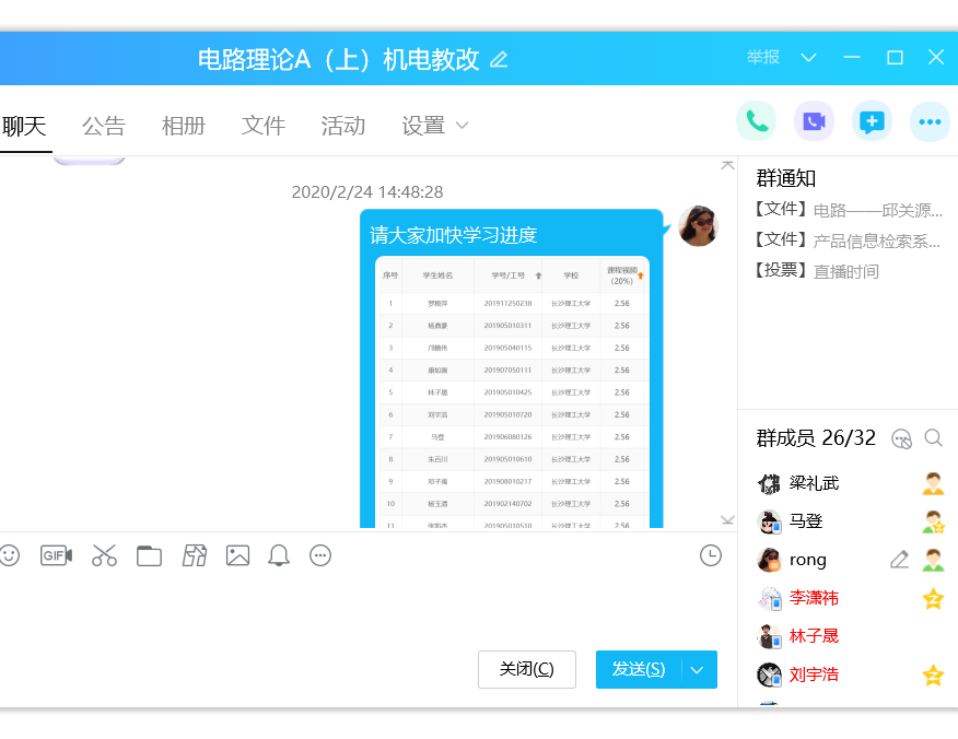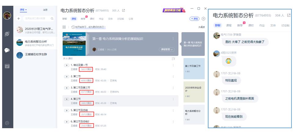 电气1704班资京同学说:“有如此负责用心的老师,何愁‘暂态’学不好,我们太幸福啦!” 学生的夸赞也得到了网络后台数据的印证,原本299人的课堂,最高时段有582人听课。