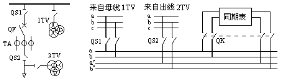 B站#1、C站#1屏上各设一块MZ-10组合式同期表,用于两站之间并列。每块屏内的同期接线如下图: