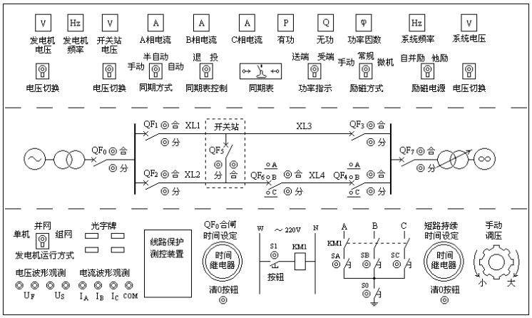 为使学生适应当前能源发展的需要,掌握分布式发电系统、模拟风力并网发电、光伏并网发电等基本结构与工作原理,发电电源考虑了风力发电、光伏发电、超级电容发电等多种电源形式,为开展新型分布式发电电源的电气控制、保护及电力电子等方面的实验与研究提供了相应的平台。为了使电气工程及其自动化专业的学生对整个电力系统有一个完整、全面的认识,使学生熟悉并掌握电力系统结构及运行特点,系统中设置了几个典型的变电站、配电站以及多条输配电线路,且组成的电力系统结构形式、变电站主接线运行方式及输配线路的参数可灵活改变。为了使学生了解不同负荷对系统的影响以及开展负荷调配控制方面的实验,系统中设置了多种负荷形式,包括静止负荷与旋转负荷。该综合实验室所配置的先进和完善的电气二次设备及监控系统与现场运行设备完全等同,包括监控系统、各种保护及各种电气自动装置。保护及监控系统采用最流行的分散分布式结构,使整个系统结构紧凑,电路简洁清晰,连接电缆大大减少。