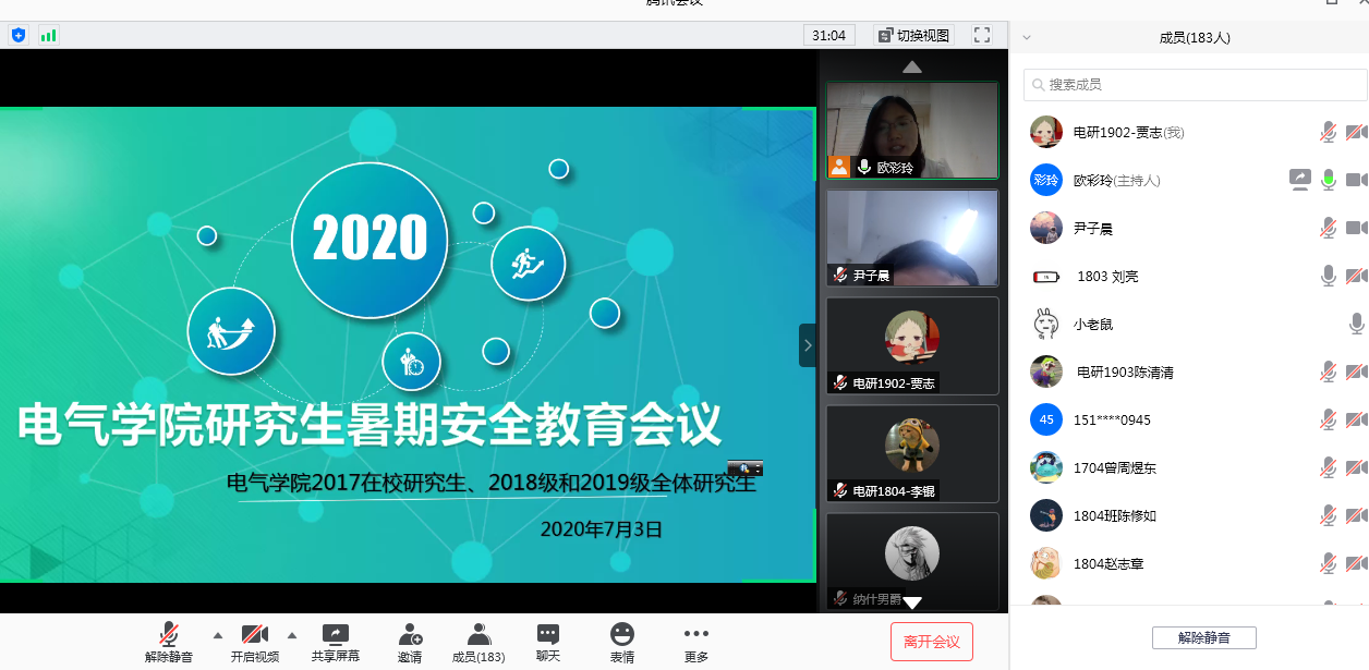 为切实做好2020暑假研究生的各项工作,增强研究生安全防范意识,2020年7月3日晚,电气学院线上召开了研究生暑期安全教育会议。会议由研究生辅导员欧彩玲老师主讲,电气学院2017级在校研究生、2018级、2019级全体研究生参会。