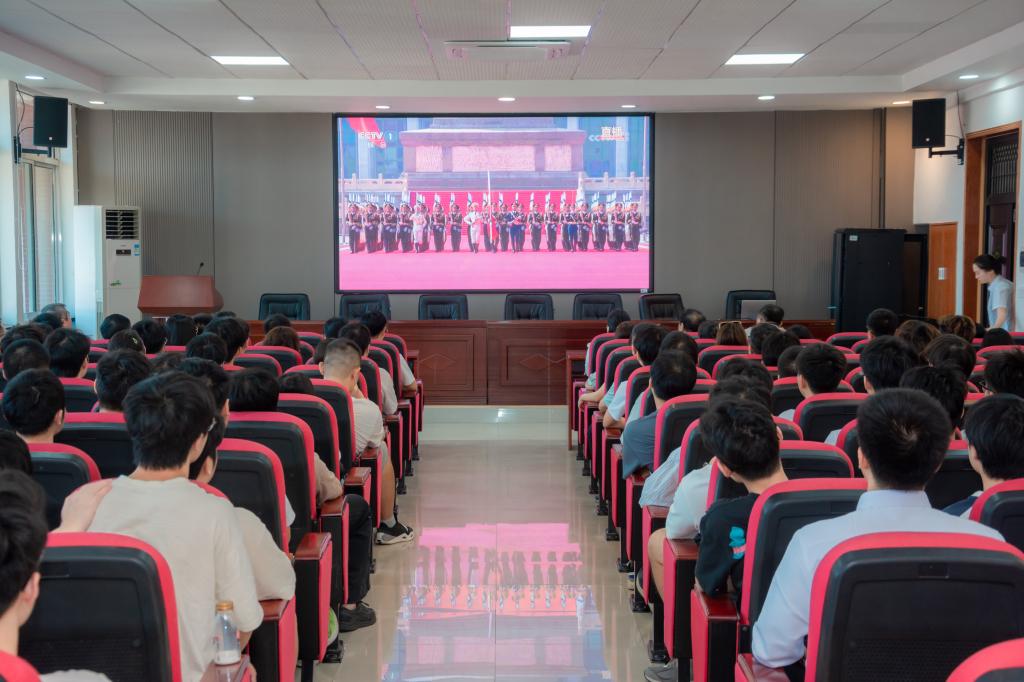 院领导、机关工作人员、系(党支部)负责人及学生代表在工一B503后街厅收看直播