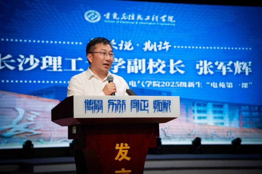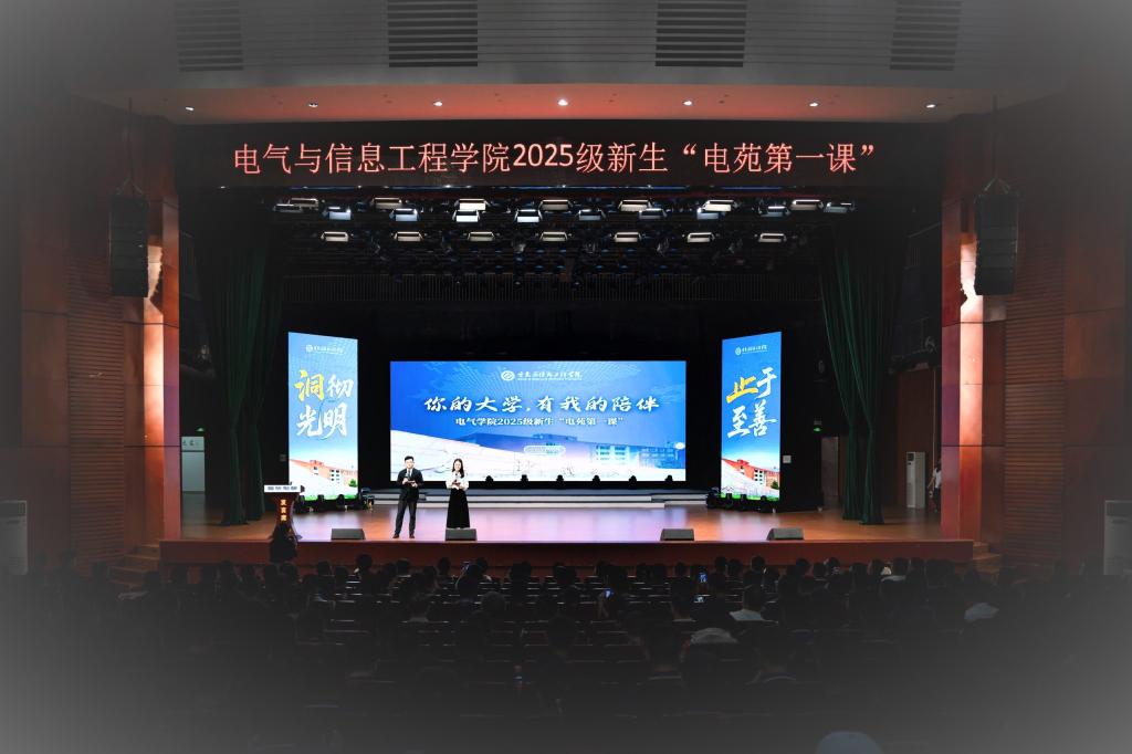 9月23日晚,2025级“电苑第一课”在云塘校区大会堂深情启幕。副校长张军辉出席并讲话,院长陆佳政、教师代表、校友代表开讲“电苑第一课”——“你的大学,有我的陪伴”。全体院领导、国网长沙供电公司代表和2025级全体新同学参加。