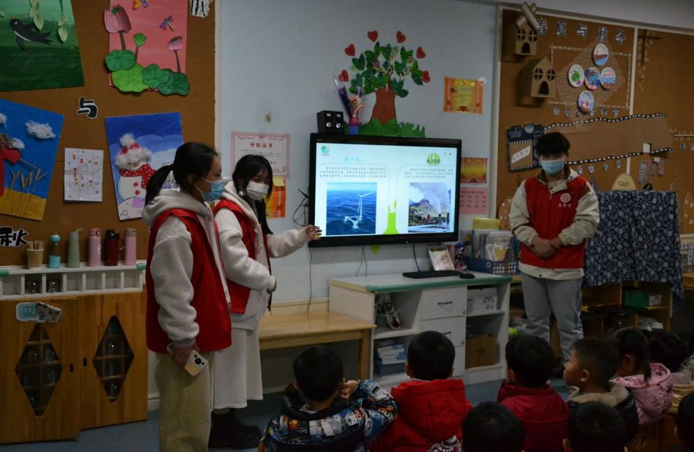 志愿者们化身小老师走进课堂,随着屏幕上丰富有趣的课件及宣讲员们生动形象的讲解,小朋友们认识了生活中无处不在的风能、水能、太阳能等绿色能源。随后,志愿者们又通过播放视频、黑板简笔画、自制教具授课等多种形式,帮助小朋友们进一步理解清洁能源发电、绿色能源优点、能源节约等相关知识。