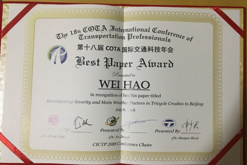 COTA国际交通科技年会每年举办一次,是海内外交通专业人士和致力于更深刻理解中国或其它发展中国家交通的交通专业人士盛会,也是国内交通运输领域最具规模、广受认可的学术会议之一。此次年会重点打造了“政府论坛”、“院长与青年学者论坛”、“交通信号控制与仿真论坛”、“新智能新交通—大数据和智能交通在滴滴”等多个特色论坛。郝威教授在两个分会场分别作了题为“Information Sharing Platform of Traffic Safety Research (交通安全共享平台的建立)”和“Road Traffic Operations, Management, and Control (交通运营管理与控制)”的主题报告,其论文被评选为最佳论文。