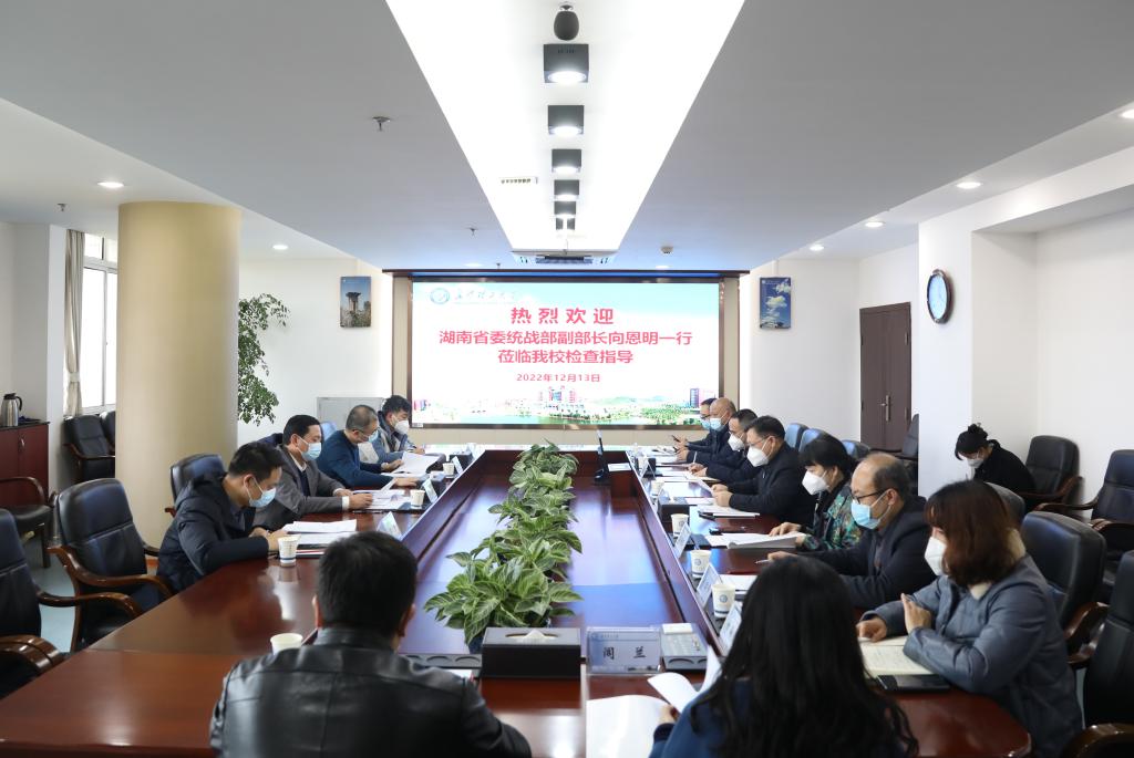 12月13日下午,湖南省委统战部副部长、省民宗委主任向恩明一行来到云顶国际vip8866检查指导工作。省委统战部民宗处、宣传处相关同志陪同检查。校党委副书记刘建民,党委委员、副校长蒋璟萍,党政办、统战部、学工部、人事处、保卫部、研究生院、国际交流处等有关部门负责人参加。