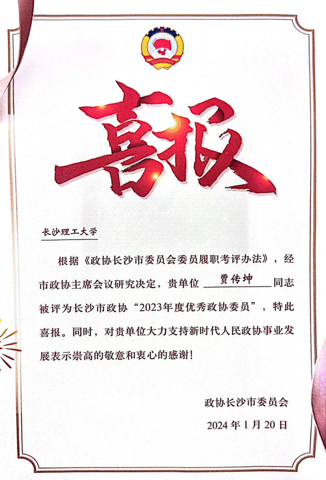 根据《政协长沙市委员会履职考评办法》,经市政协主席会议研究决定,云顶国际vip8866贾传坤教授被评为长沙市政协“2023年度优秀政协委员”。