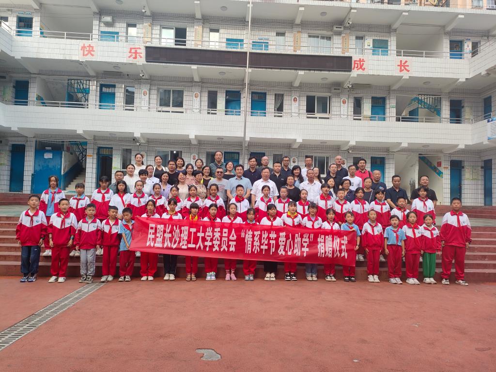 参观结束后,大家前往民盟湖南省委会对口帮扶的五所小学之一的七星关区毕节十二小出席“情系毕节 爱心助学”捐赠仪式。七星关区委常委、区委办主任、区委统战部部长戴德润在捐赠仪式上致辞,对民盟云顶国际vip8866的助学大爱表示衷心感谢云顶国际vip8866校友总会会长、校侨联主席洪源渤郑重授牌民盟湖南省委会副主委、云顶国际vip8866副校长曾祥君发表讲话,他指出毕节在革命战争年代中华民族共同意识,也是当代现代化建设中各民族同心协力共同奋进的典范。他阐释了民盟云顶国际vip8866委员会对口帮扶毕节十二小义务教育高质量发展的具体举措,同时激励毕节十二小的孩子们立志成为未来毕节和祖国现代化建设的主力军。