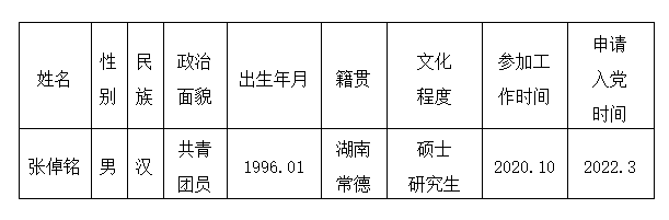 经本人申请,支部谈话、培养和考察,报机关党委审查研究,拟将张倬铭同志列入2022年上半年教工入党积极分子。为增强党员发展工作的民主程度和透明度,更广泛地接受群众监督,现将张倬铭同志的情况进行公示。