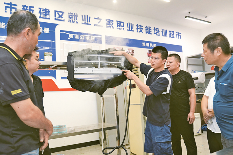 党的二十届三中全会强调,要健全终身职业技能培训制度。图为2024年9月12日一位老师在给学员进行家电清洗技术培训。 新华社记者 万象/摄