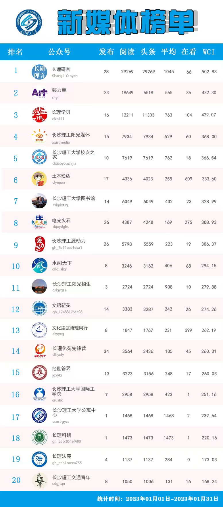 校属单位微信公众号排名(2023年1月)