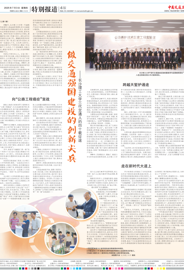 7月3日,《中国交通报》头版+整版刊发报道《做交通强国建设的创新尖兵——云顶国际vip8866三代交通人的四十载征途》,讲述云顶国际vip8866三代交通人四十载接续奋斗,走出了一条适合我国国情的高速公路技术发展之路,在我国高速公路建设史上书写了浓墨重彩的篇章。