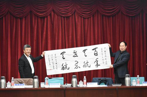 总结汇报及交流座谈会的召开恰逢中交天津航道局有限公司120年华诞,会议正式开始前,黄立宏代表学校,水利学院常务副院长胡旭跃代表学院向中交天津航道局有限公司赠送了百年天航  世界天航书法礼品和湘绣礼品。