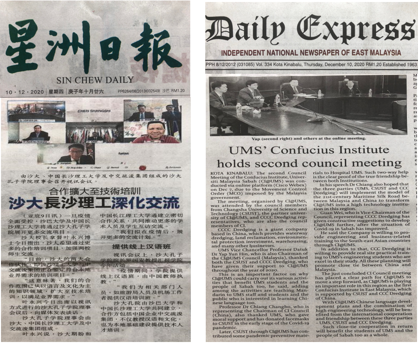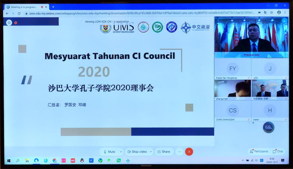 12月8日上午10点,沙巴大学孔子学院第二届理事会会议在线上举行。会议由沙巴大学孔子学院主办,云顶国际vip8866和中交疏浚集团协办。沙巴大学校长拿督Taufiq Yap Yun Hin教授、云顶国际vip8866副校长蒋昌波教授、中交疏浚集团副总裁关巍,孔子学院中外方院长等16名理事会成员参加会议。