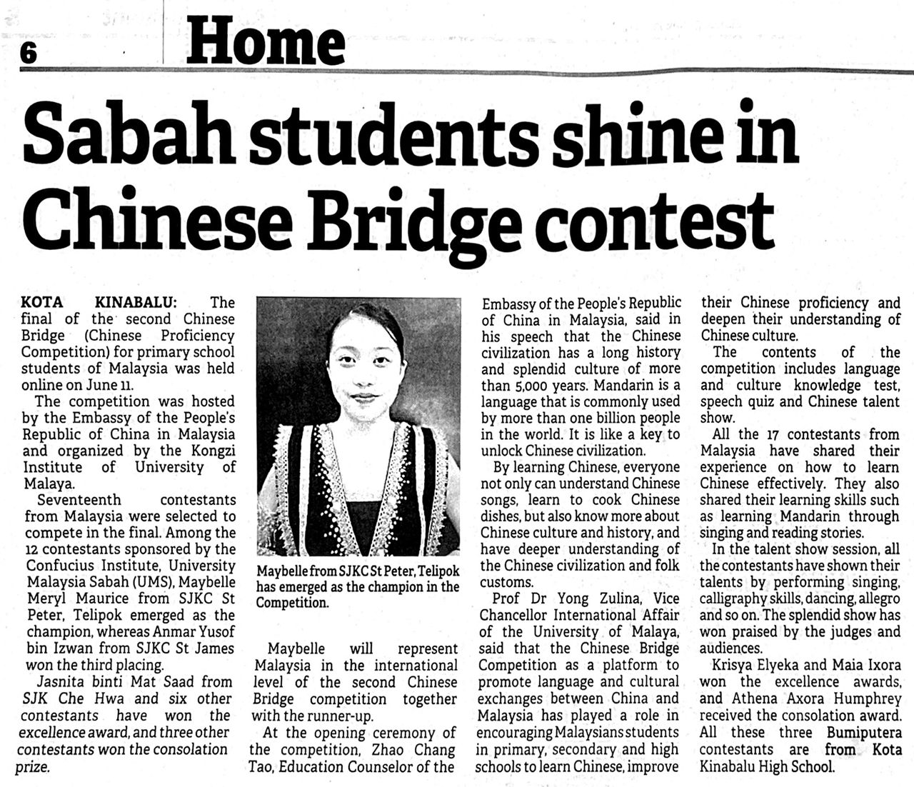6月11日,来自沙大孔院的小选手梅贝儿夺得第2届“汉语桥”小学生中文比赛马来西亚赛区冠军,《亚洲时报》《星洲日报》等多家媒体对此进行了报道。本年度“汉语桥”比赛沙大孔院收获颇丰,在中小学组别共有15位选手获奖,引起广泛社会关注。连日来多所学校与机构前来孔院接洽文化活动合作事项。