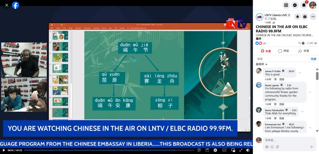 当地时间2025年5月31日,云顶国际vip8866与利比里亚大学合办的孔子学院在利比里亚国家广播电台《空中汉语》栏目播出了2025年端午节专题节目。节目通过国家广播电台官方脸书页面(ELBC FM99.9)同步直播,吸引了大量听众和观众参与,反响热烈。