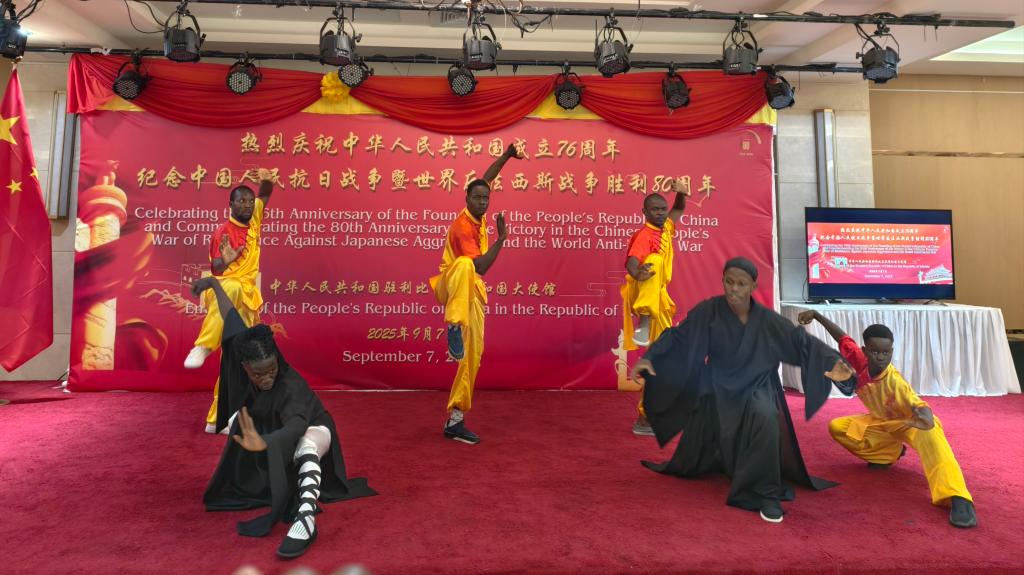 招待会伊始,尹承武大使在致辞中回顾了中国在过去几十年取得的发展成就,强调了中国人民抗日战争暨世界反法西斯战争胜利对中国和世界和平的重要意义,提及台湾光复80周年的历史时刻,并感谢包括非洲国家在内的国际社会在抗战时期对中国的宝贵支持。大使还介绍了近年来中非合作的新进展,特别是习近平主席提出的一系列对非合作倡议,彰显中非携手共赢的良好局面。