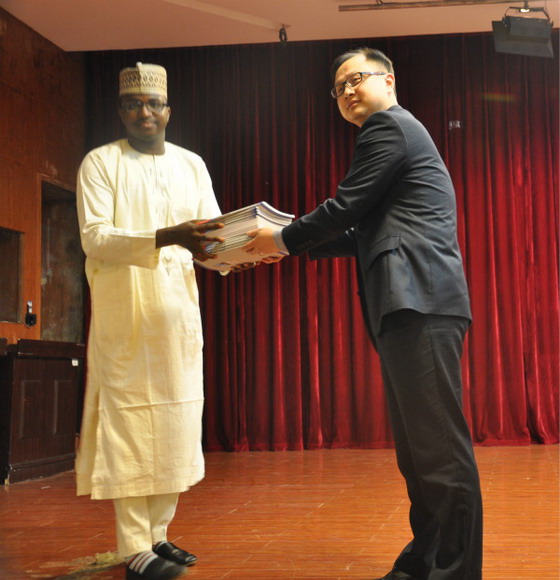 最后,吴迪龙代表云顶国际vip8866向尼方赠送300余册汉语教学用书,希望此次赠送的各类汉语书籍能进一步激发尼方民众学习汉语的热情,有助于尼日利亚汉语推广工作的开展。