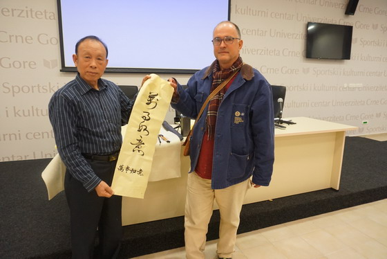 11月17日,活动第二场在黑山大学多媒体教室举行,近百名学生参与此次讲座。由孔院外方院长米莱娜主持,覃先美教授主讲。覃教授生动讲述汉字发展的历史和特点,并举例说明汉字的表意特征。随后讲座进入互动环节,同学们积极回答汉字问题,覃教授一一为他们送上墨宝。在热烈的掌声中,此次专题讲座完美落幕。