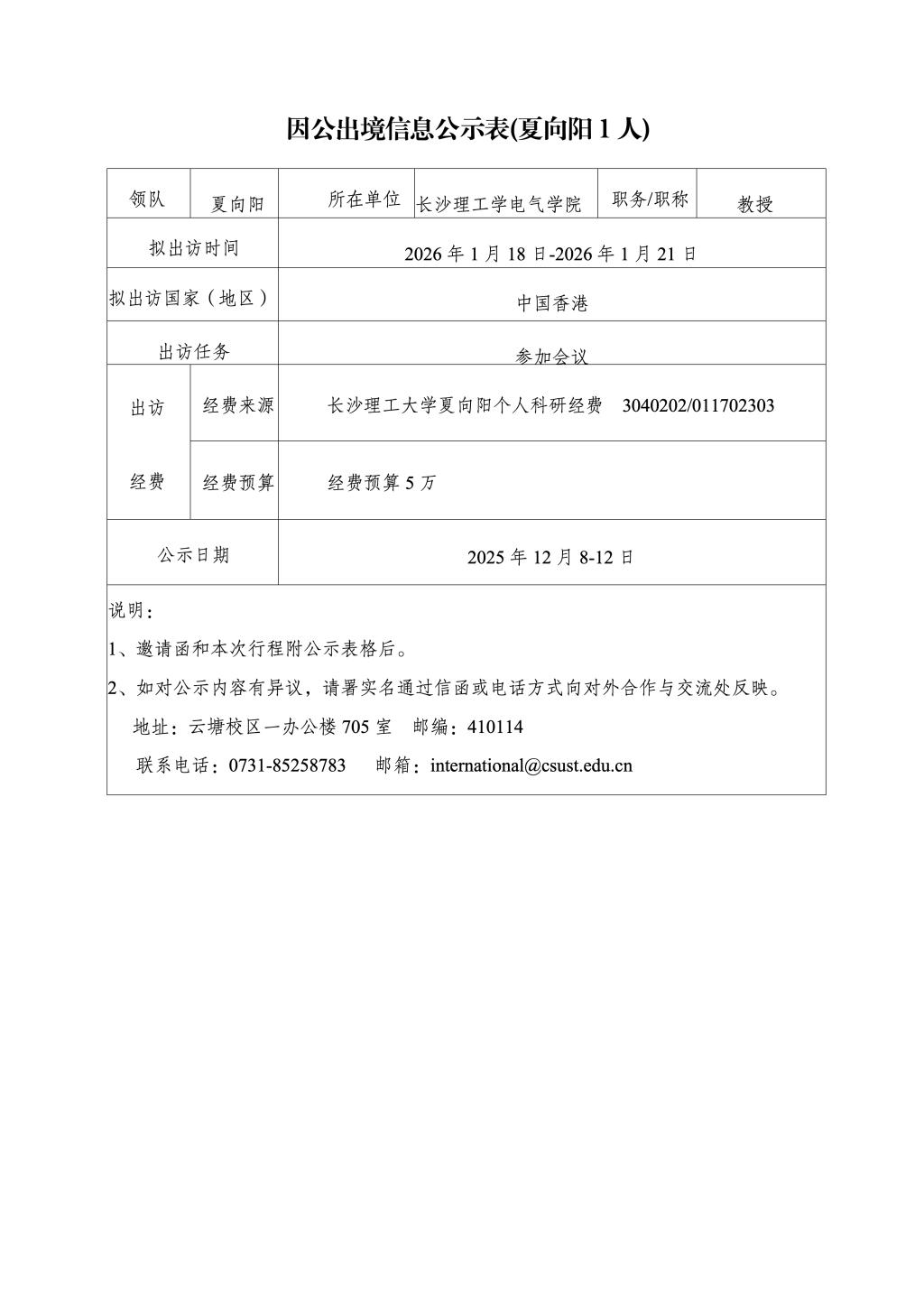 因公出境信息公示表(夏向阳1人)