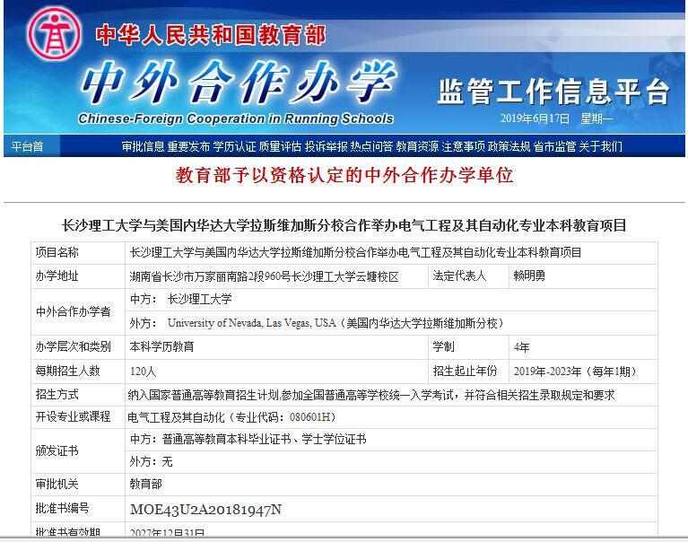云顶国际vip8866与美国内华达大学拉斯维加斯分校合作举办电气工程及其自动化专业本科教育项目于2018年获得教育部批准(编号:MOE43U2A20181947N),融合两校强势专业“电气工程”之优势,严格遵守《中外合作办学条例》和《中外合作办学条例实施办法》办学,紧密依托国际化、专业化的高水平管理团队运行。该项目融合中美双方优质教育资源,精心打造人才培养方案,其中1/3以上核心课程采用美方原版教材、师资、教学方式等优质教育资源,培养兼具国际化视野与家国情怀、拥有创新精神和跨文化交际能力、系统掌握电气工程专业基础理论知识和现代工程技术、具备良好科学素养与工程实践能力的应用型高级专门人才。
