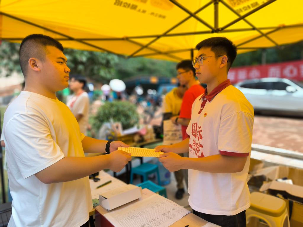 地铁口、校门外、宿舍下,学院学生党员和中外志愿者们身着整齐的文化衫,服务于新生入学的各个方位,为新生顺利报到做好保障,以初心育初“新”,帮助新生树立正确的理想信念,助推新生梦想启航。