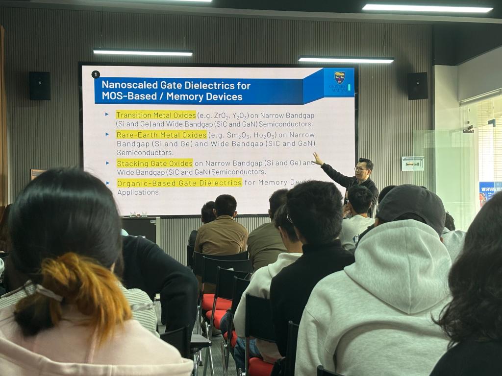 首场讲座于14:00准时开讲,WONG YEW HOONG以“纳米电子材料的前沿进展:高介电常数栅介质、电子封装及气体传感应用”为主题,聚焦高k栅介质薄膜、电子封装材料和气体传感纳米材料的前沿进展,剖析其在升级下一代纳米电子系统性能、可靠性与可持续性上的关键价值,并介绍了纳米电子材料在微电子、传感器领域的广阔应用图景。