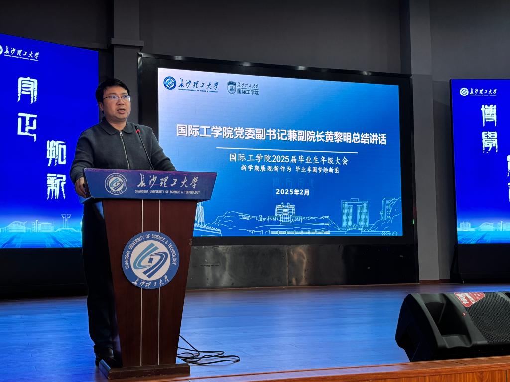 新学期展现新作为,毕业季圆梦绘新图。2月27日下午,国际工学院于学生活动中心科技报告厅召开2025届毕业生年级大会,学院党委副书记兼副院长黄黎明、教务办主任余志、教务办老师罗帅、年级辅导员唐宏敏、魏涛及2025届全体毕业生参会,会议由魏涛主持。