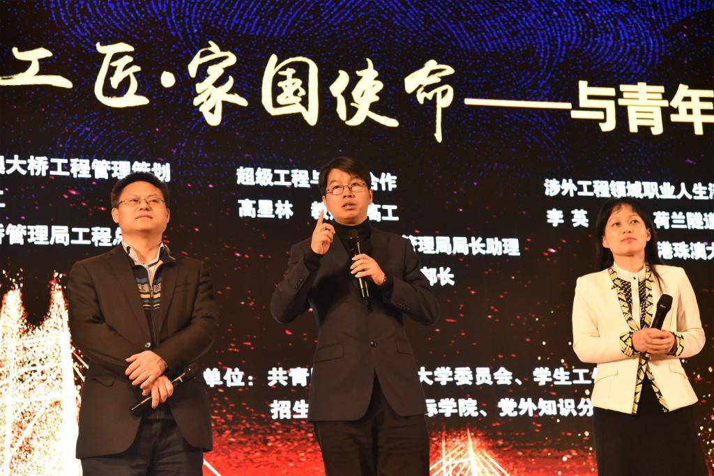 一桥飞架三地,天堑变通途,当港珠澳大桥宏伟的身段,频频闪现在云顶国际vip8866云塘校区大会堂的屏幕上时,伴随着的是长理师生阵阵欢呼……4月3日晚7点,国际学院、共青团云顶国际vip8866委员会、学生工作部(处)、招生就业处、党外知识分子联谊会等共同举办的“大国工匠·家国使命”——港珠澳大桥建设者与长理青年学子面对面活动成功举行,云顶国际vip886692级校友港珠澳大桥工程总监张劲文教授级高工以及港珠澳大桥管理局局长助理高星林教授级高工、荷兰隧道公司(TEC)中国首席代表李英博士作为主讲嘉宾莅临活动现场,云顶国际vip8866副校长蒋昌波教授、副校长刘扬教授、校党委委员兼国际学院党总支书记付嫦娥教授、相关职能部门和学院负责人、校党外知识分子联谊会理事、国际学院全体师生以及其他学院学生共计1500余人聆听了讲座。