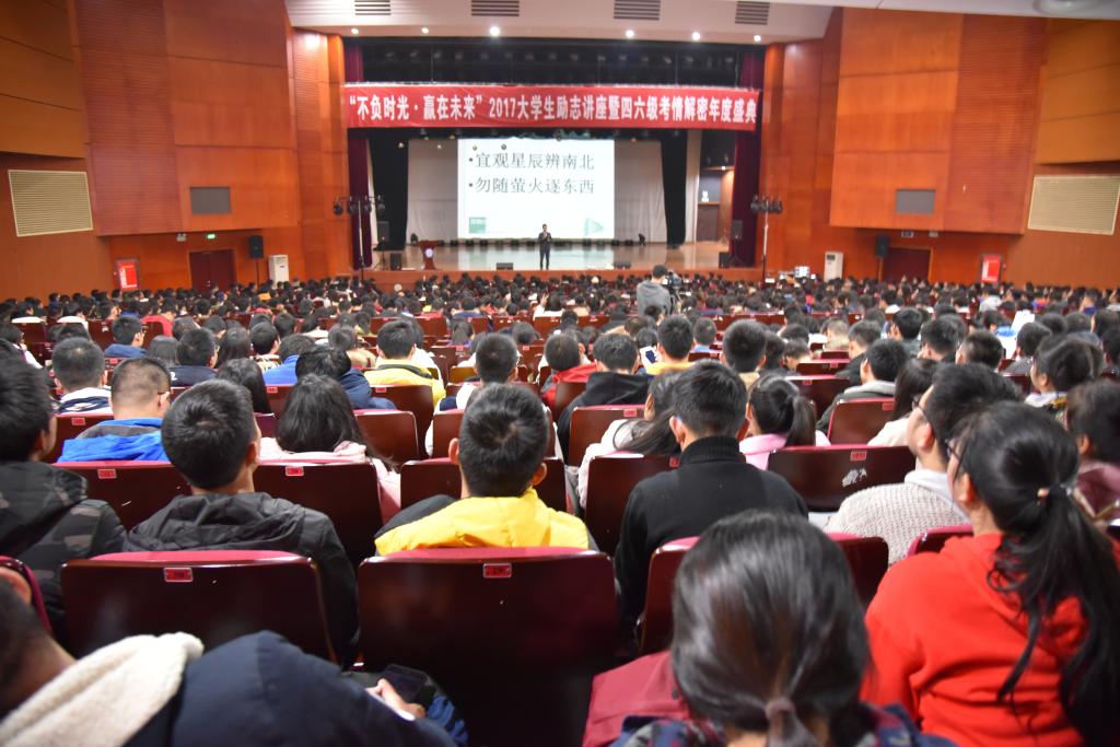 12月6日,国际学院和校团委联合举办的“不负时光,赢在未来”大学生励志讲座暨四六级考情解密年度盛典在云顶国际vip8866云塘校区大会堂举行。长沙新东方学校副校长、优秀的四六级讲师、被称为“金山词霸”的范超老师走进云顶国际vip8866,为同学们带来了一场青春励志和英语学习的盛宴。