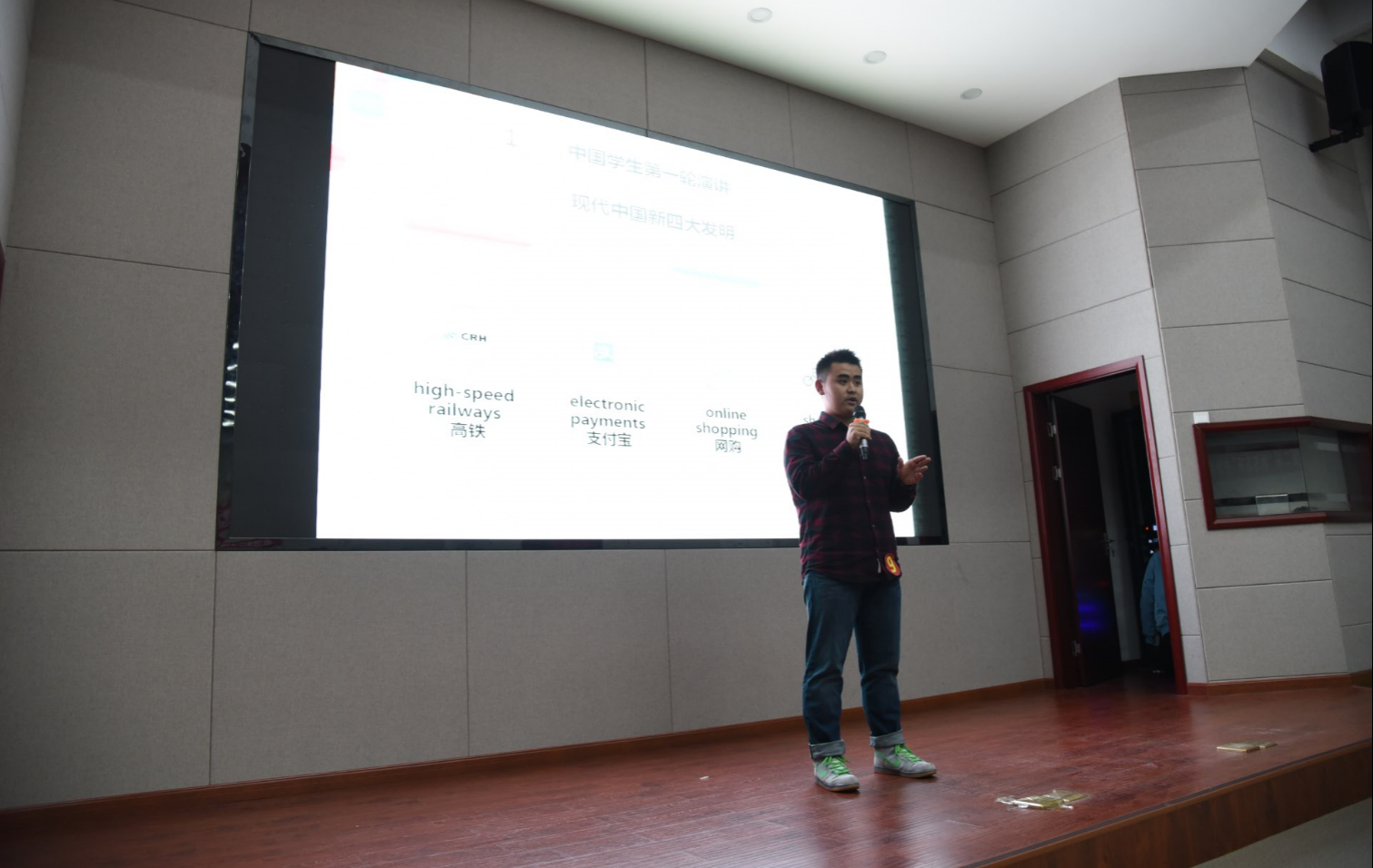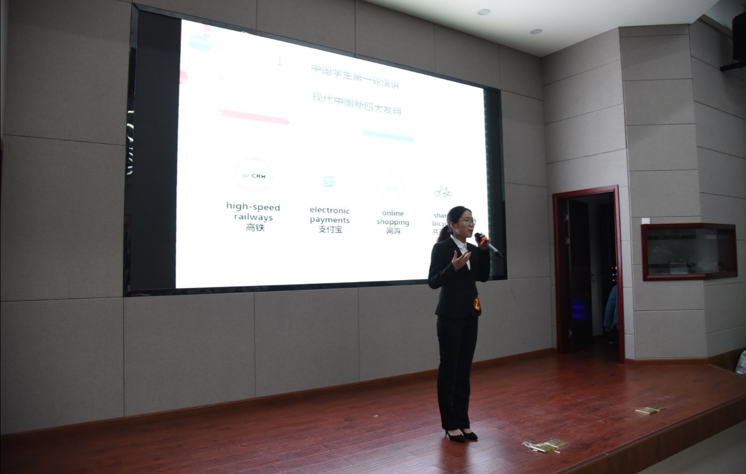 中国学生组的决赛分为主题演讲、即兴演讲、和看图说文三轮赛事。第一轮演讲以中国“新四大发明”主题展开,每位选手准备充分,精神饱满,纷纷展现出良好的英语表达能力;第二轮的即兴演讲是以习近平总书记给年轻人的七条建议展开,进入第二轮的8名同学随机抽取了其中的一条,经过五分钟时间的准备后,进行了即兴演讲。最后一轮是看图说文,进入第三轮的4名同学随机抽取一张图片,根据图片的内容进行演讲,评委根据选手的表现进行打分,综合现场大众评审投票和场外微信投票得分,最终国际学院高添雄获得决赛总冠军,外国语学院梁海燕获得亚军。