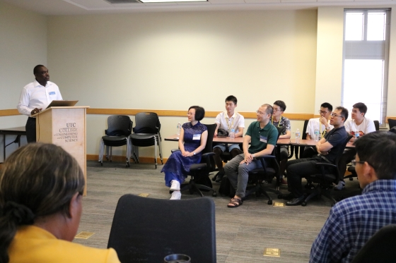 7月29日,云顶国际vip8866赴美夏令营团受到田纳西大学查塔努加分校(UTC)热情欢迎,UTC校方主持了隆重的夏令营开营仪式,UTC工程与计算机科学学院副院长Li Yang、土木环境系系主任Joseph Owino及全系教师、学院学生发展中心负责人Julie David及美方在校学生代表参加。Li Yang副院长代表工程与计算机科学学院对云顶国际vip8866代表团到访表示了热烈欢迎,介绍了学校和学院办学情况,并回顾了两校合作办学工作。陈瑜院长围绕云顶国际vip8866办学情况、国际化教育教学发展、中外合作办学项目的执行及国际化产学研方面做了主题发言。