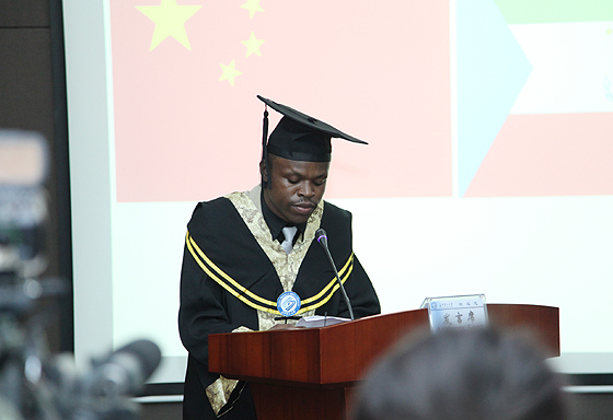 佳瓦力同学代表全体赤道几内亚毕业班留学生上台发言,他用流利的中文表达了对学校和不辞辛劳培育、教诲学生的老师们的感恩之情,并祝福母校基业长青、再续辉煌!